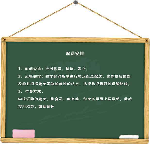 5、配送价格构成及报价说明书:配送价格包含蔬菜的收购价格、分拣运输的损耗和搬运运费、运输费、国家法律规定的税费和行业交易费和我们企业的毛利等方面。在制定配送价格的过程中,根据蔬菜行业的各种特殊性,我们主要采取随行就市的原则主要采取由供应商定期(周报、旬报、月报)报价、采购方核价的方式进行(当有分歧的意见时,双方议价协商解决)。